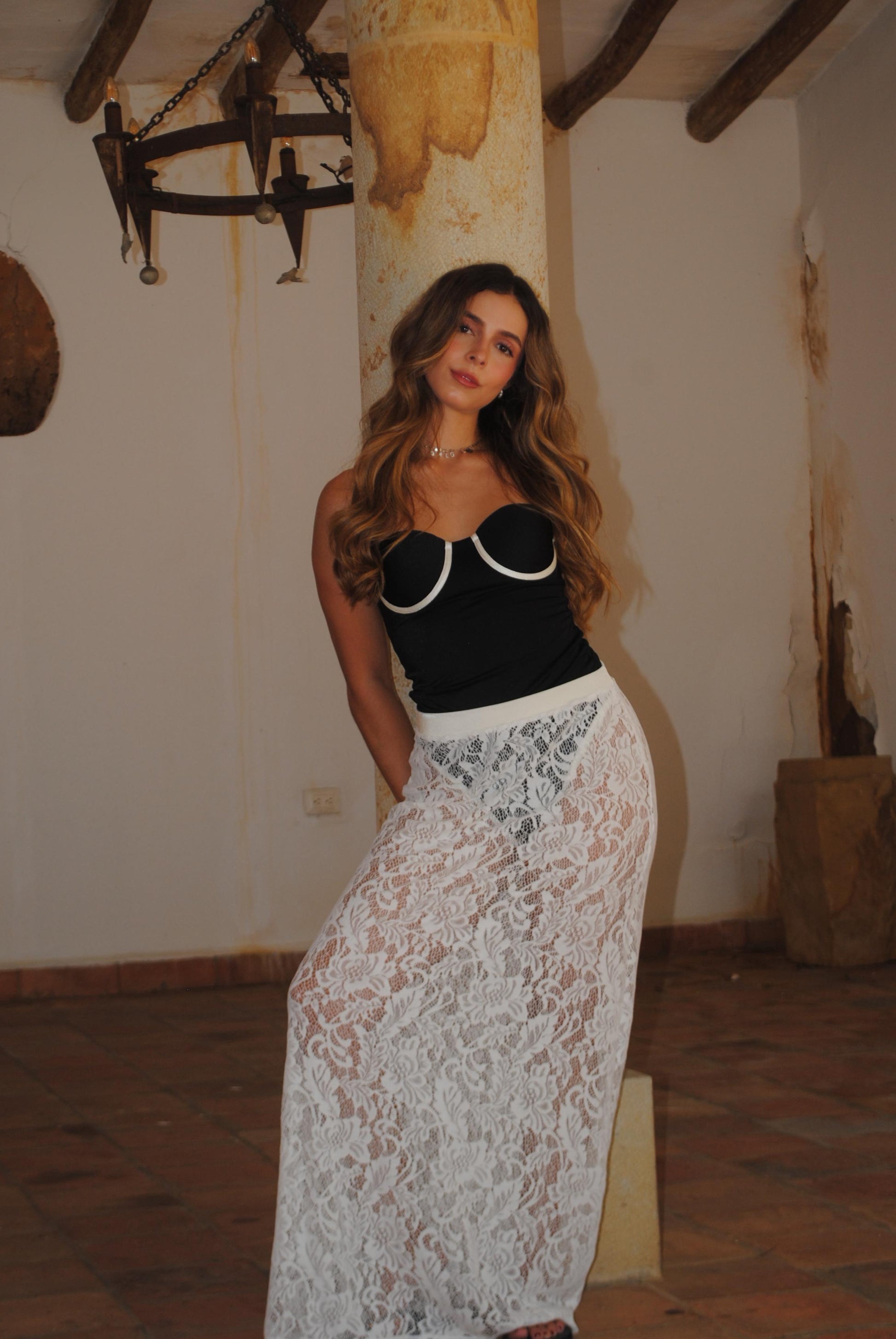 Falda larga de encaje en tono blanco marfil, pensada como salida de baño. Su diseño elegante, delicado y femenino aporta un aire sofisticado y ligero, ideal para complementar tus bikinis y enterizos con un toque de estilo atemporal.
